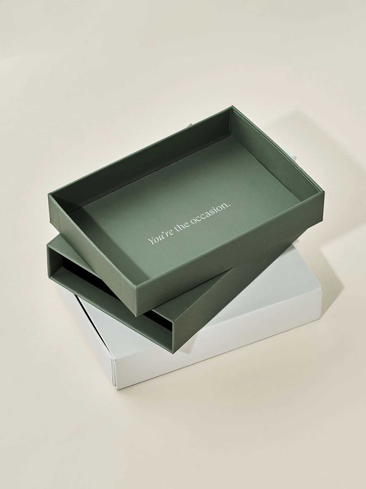 Give them the full package with our signature gift box in olive green or cream. Features a practical sliding mechanism for the ultimate unboxing experience. Also great for keeping essentials safe. Can fit up to 4 pieces of jewelry depending on size.